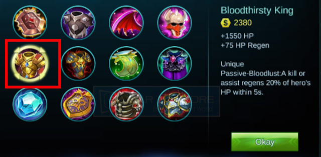 Gear ini biasanya sangat cocok untuk hero dengann type TANK karena setiap kill/assist yang di buat akan menghasilkan HP hero tersebut sebanyak 20 persen dan biasanya hero denga jenis TANK sangan banyak mendapatkan assist, di sini saya mengambil contoh tigreal sebagai hero tank yang mampu menghasilkan banyak assist dengan skill ulti miliknya yang mampu mendorong banyak lawan sekaligus, tentu tidak hanya tigreal, tapi untuk hero favorit kalian yang lain juga akan sangat membantu seperti akai ataupun gatotkaca yang mampu memberikan serangan terhadap banyak lawan.